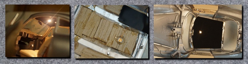 Die Scheinwerfer lassen sich bei diesem Modell recht gut beleuchten. Der Inneneinsatz wird mit einer SMD-LED versehen. Diese sitzt damit so ziemlich am "Originalplatz". Vor dem Verkleben erfolgte natürlich wieder ein Test um die Wirkung zu sehen. Letztlich wird die Funktion zwischen Fern- und Abblendlicht über unterschiedliche Helligkeiten geregelt. Für das Standlicht gibt es ganz wenig Strom um das realistisch wirken zu lassen. Im Ausgeschalteten Zustand ist leider der gelbliche Verguss der LED zu sehen. Versuche mit Anpinseln oder Filterfolien verliefen unbefriedigend. Also bleibt das so... |